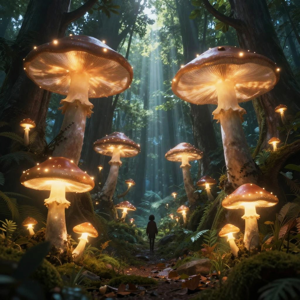 A vibrant digital illustration of a mystical forest bathed in blue and green light. A small, silhouetted child with a backpack stands in the foreground, facing a towering, serpentine creature with a long, curling tail. The forest is teeming with colorful, glowing mushrooms in shades of orange, red, blue, and purple, and illuminated by ethereal bioluminescence. Tall trees with dense foliage frame the scene, and light filters through the canopy, creating a magical, otherworldly atmosphere. The child's silhouette contrasts with the vivid, luminescent forest, adding a sense of awe and wonder.