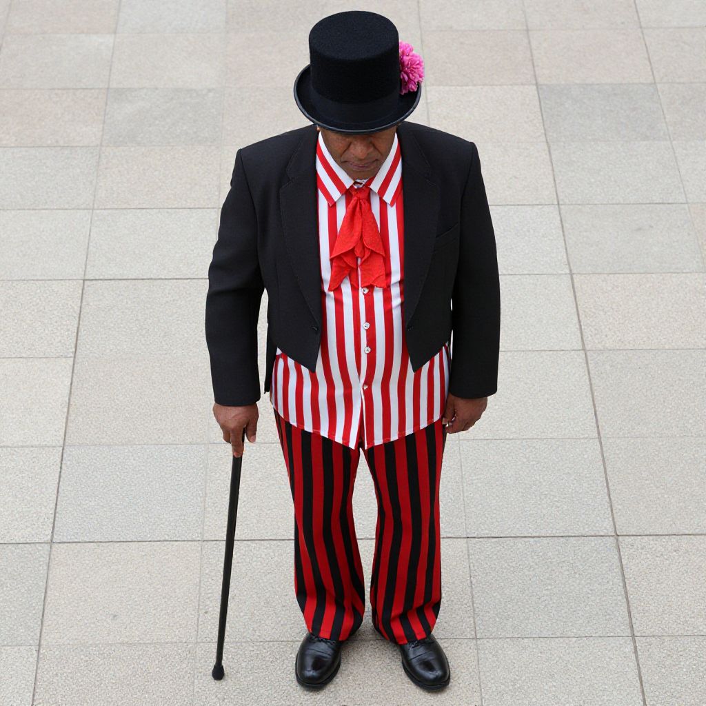 A man is wearing a black top hat with a pink flower on it. He is also wearing a red and white striped outfit with a black jacket and a black and red striped pants. The man is holding a cane in his right hand and is standing on a tiled floor.