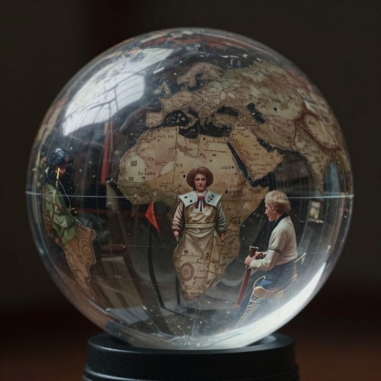 Photograph of a glass globe with a detailed world map inside, featuring two small, intricate figurines. A young woman in a light brown, military-style uniform with a red ribbon stands centrally, facing forward. An older man in a white shirt and blue tie sits to the right, holding a cane. The globe is mounted on a black base, and the background is dark, highlighting the globe's reflective surface. The map includes country names and borders, with the figures' reflections visible on the glass. The image has a vintage, historical feel.