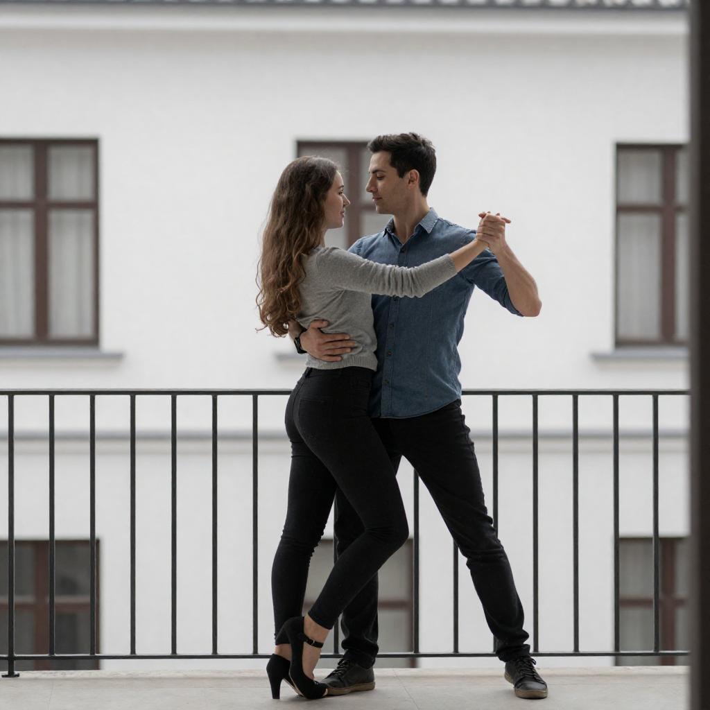 Photograph of a young couple dancing on a balcony. The woman, with long brown hair, wears a gray sweater and black pants, while the man, with short dark hair, wears a blue shirt and black pants. They are in front of a white building with black-framed windows and a black iron railing. The man lifts the woman mid-dance.