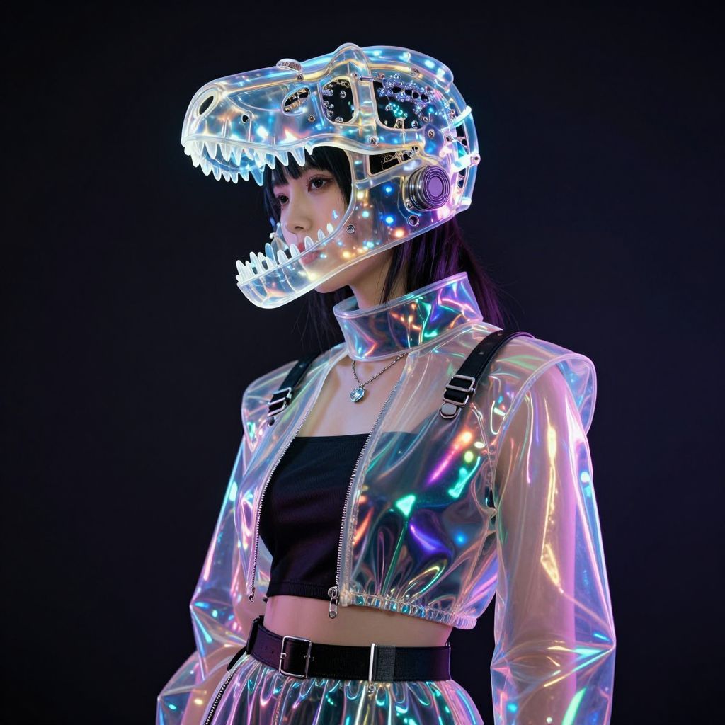 A woman in a futuristic, cyberpunk outfit featuring a translucent dinosaur skull helmet and bio-luminescent, iridescent clothing stands under dramatic lighting, evoking a sci-fi, avant-garde aesthetic.