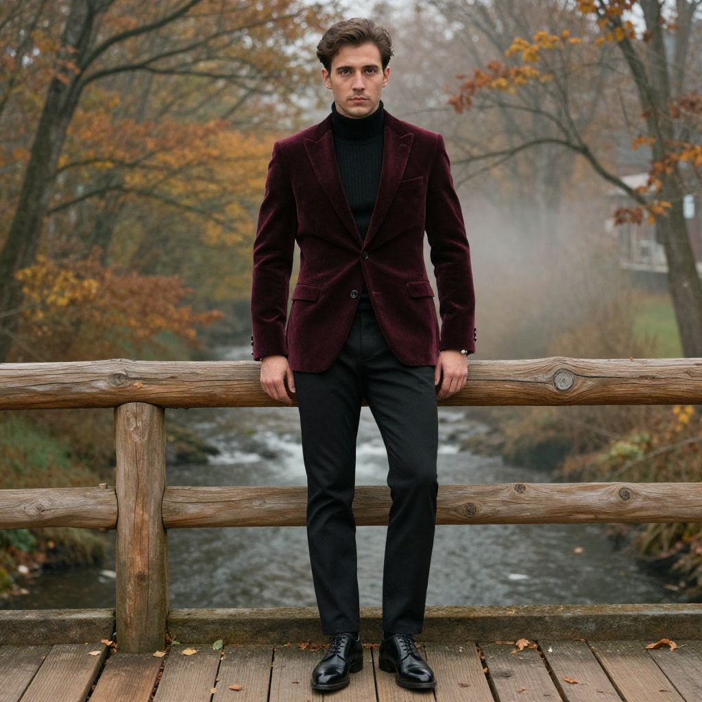 A man, burgundy velvet blazer, black ribbed turtleneck, slim-fit black trousers, polished black oxford shoes, subtle silver cufflinks, rustic wooden bridge, surrounded by autumn foliage, mist rising from the river below, technicolor analog film stock, contemplative expression. Man has masculine face and piercing eyes