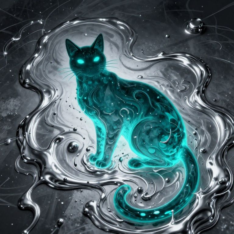 Liquid silver flowing out of a meteor, swirling and gathering on the floor, solidifying into the shape of a humanoid cat silhouette, glowing an ominous teal color, Realistic Niji Stan Katayama style