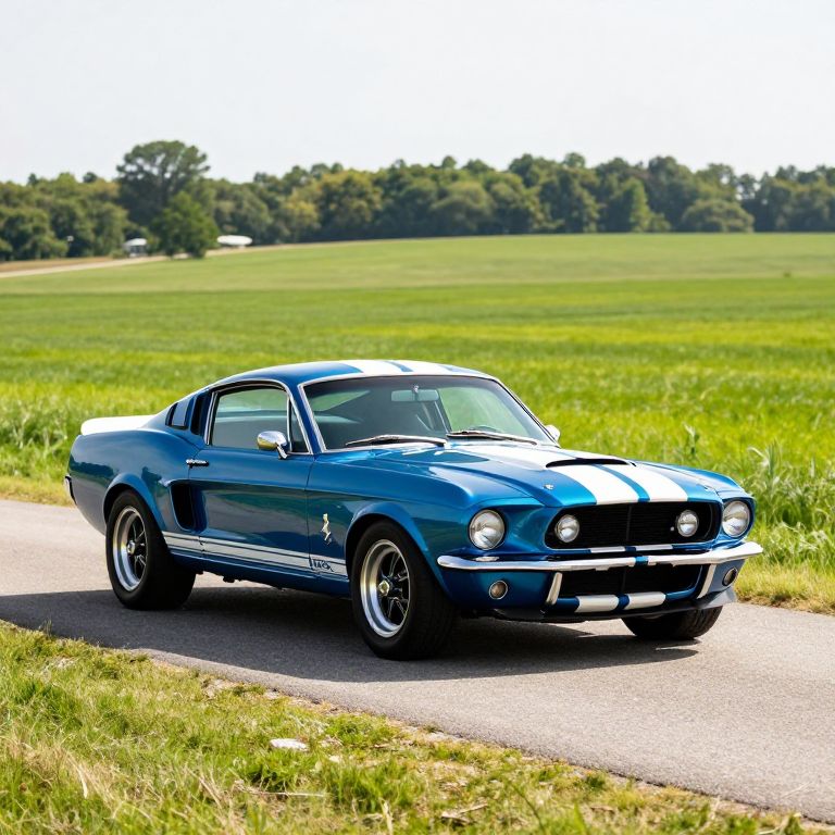 Photograph of a vibrant blue classic Ford Mustang convertible with black racing stripes, parked on a rural road with lush green fields and trees in the background.