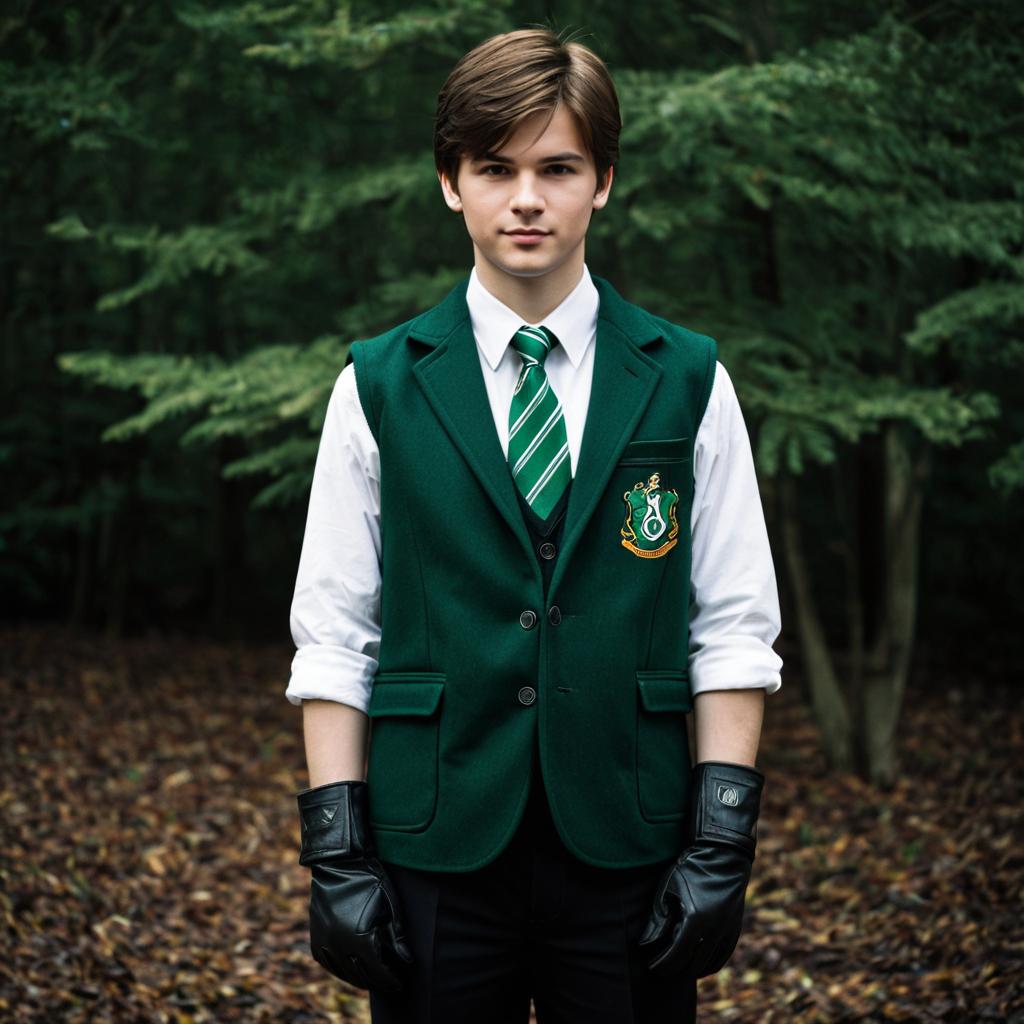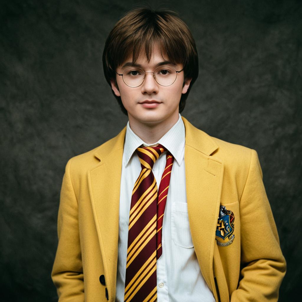 Portrait of a young male wearing Hogwarts school uniform featuring a black coat with a Hogwarts crest, white collared shirt, and diagonal-striped maroon and yellow necktie. He is standing outdoors in an autumn setting with fallen leaves, trees with yellow foliage, and a lamppost in the background. The subject has short brown hair, round glasses, and is looking directly at the camera with a neutral expression.