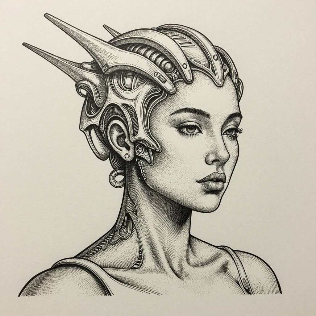 Black-and-white digital drawing of a futuristic, cybernetic woman with intricate headgear, detailed facial features, and a calm expression.