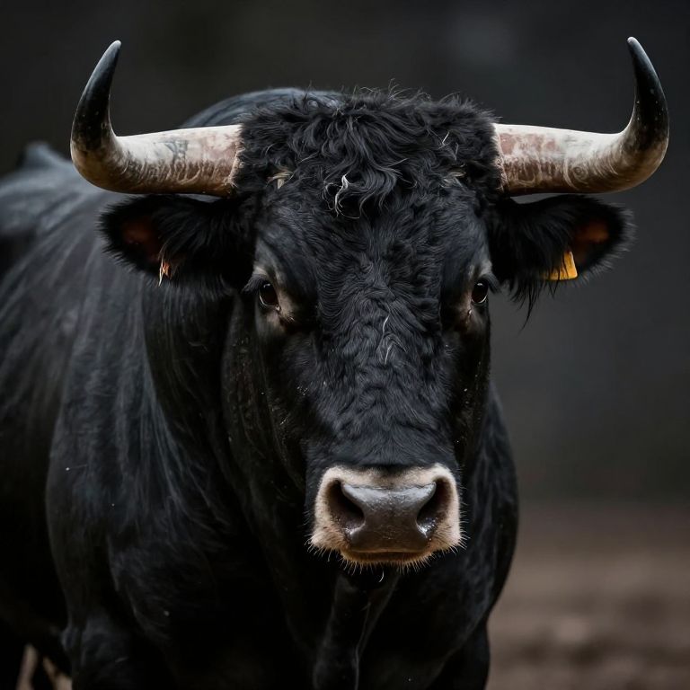 Photograph of a close-up black cattle face with large, curved, white-tipped horns. The cattle's dark, wet fur appears slightly curly, and its eyes are wide and brown, reflecting light. The nose is prominent and white with a textured surface. The background is blurred and dark, highlighting the cattle's detailed features. The overall image has a high contrast and vivid color, emphasizing the animal's striking appearance. The lighting is subtle, creating a natural yet dramatic effect. The focus is sharp on the cattle's face, with a shallow depth of field.