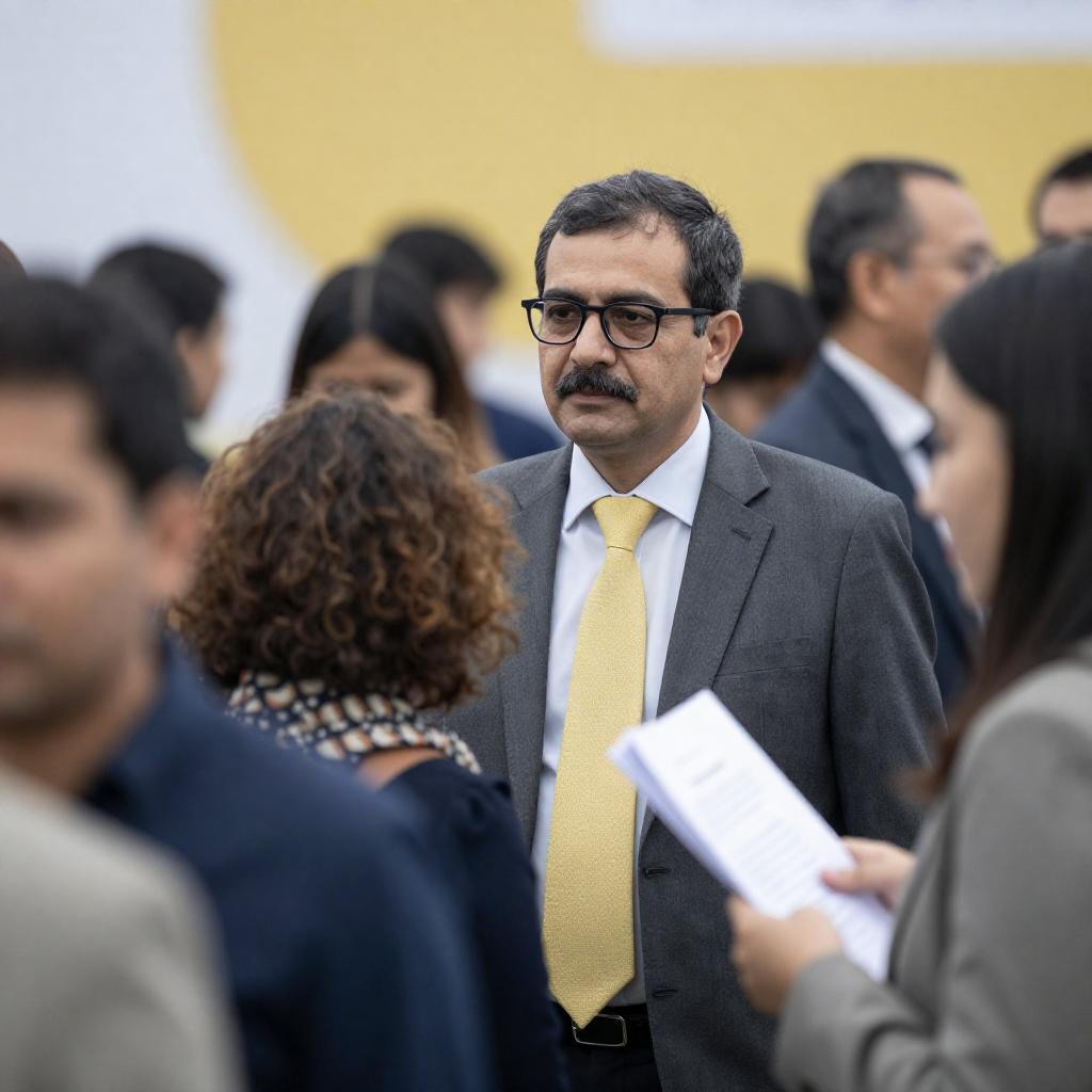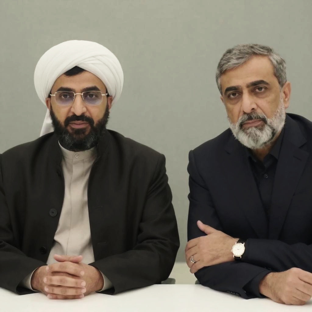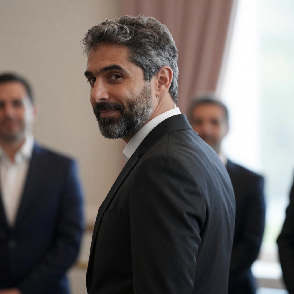 Photograph of three men in dark suits with white shirts and black ties, standing in front of a tiled wall. The man on the left has a mustache, the man in the middle looks up, the man on the right looks right. All have dark hair, formal attire, and pocket squares. Yellow poster in the background. The men are in a mid-shot, facing each other, with neutral facial expressions.