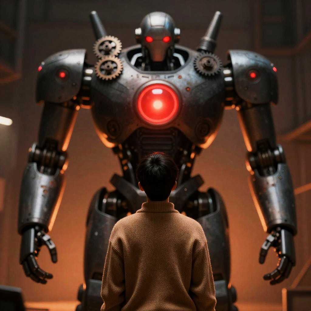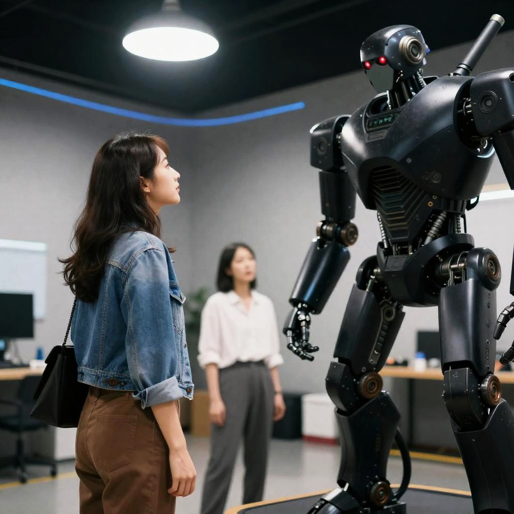 Photograph of a woman with long dark hair in a denim jacket and brown pants, looking at a large, black, robotic creature with red eyes and metallic ure. Another woman in a white shirt and gray pants stands in the background. Bright overhead lights, strings of blue lines, and industrial setting. Robot creature on the right, woman on the left.