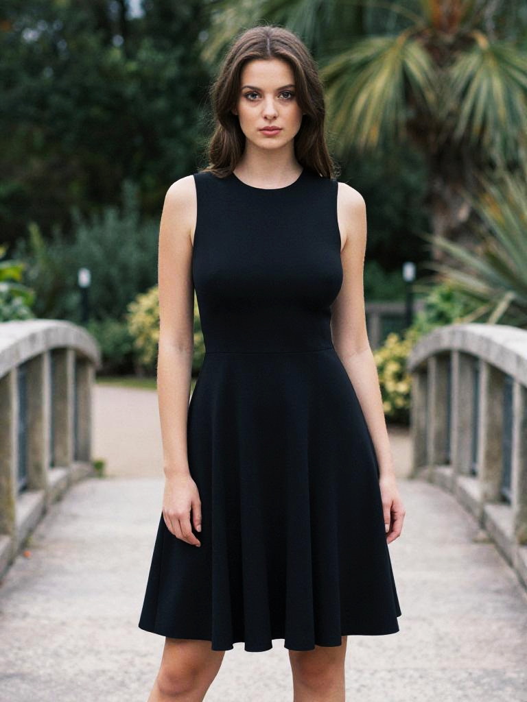 Photograph of a woman with wavy brown hair, wearing a black polka dot sleeveless dress with white lining, and white sneakers, standing in