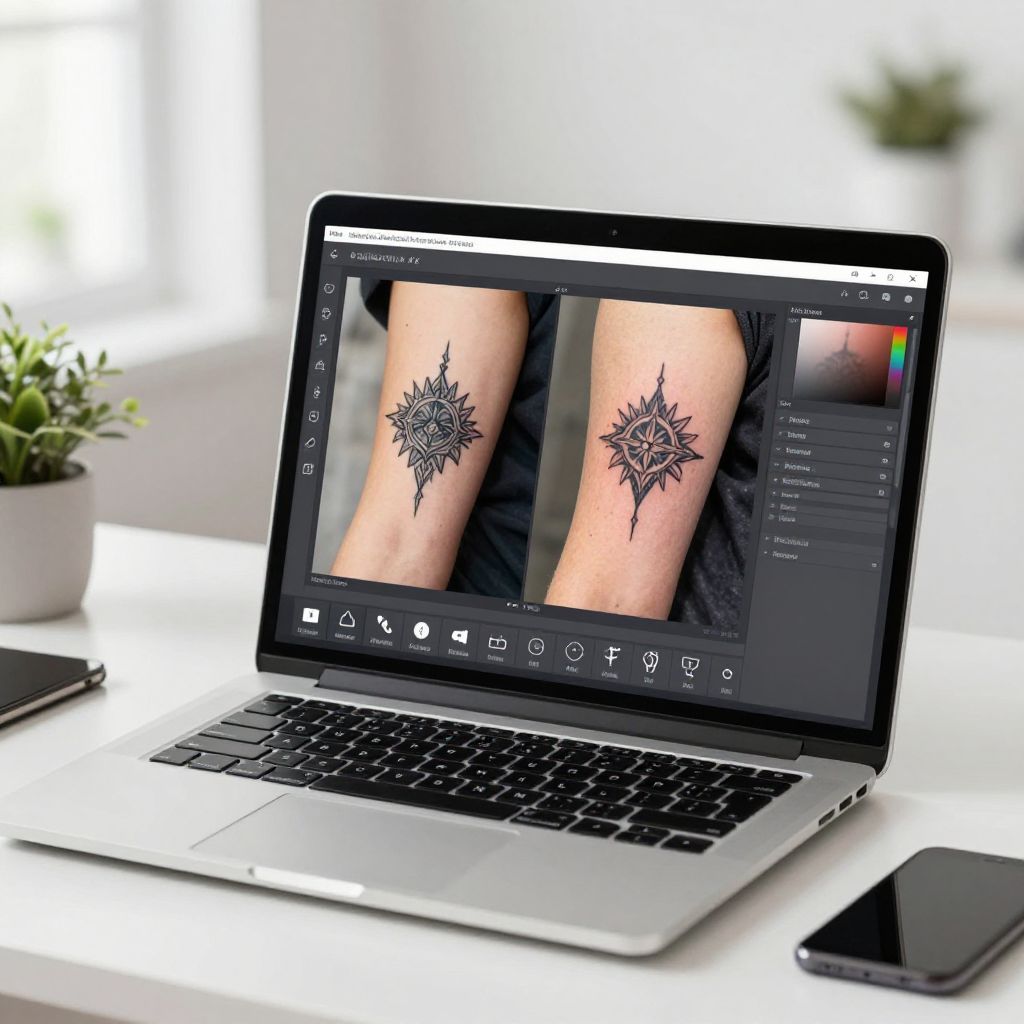 Remove tattoo from photo online free, digital art showing a clean photo editing workspace with a laptop screen displaying before and after images of tattoo removal, modern and sleek UI, bright and airy studio lighting, hyper-realistic style