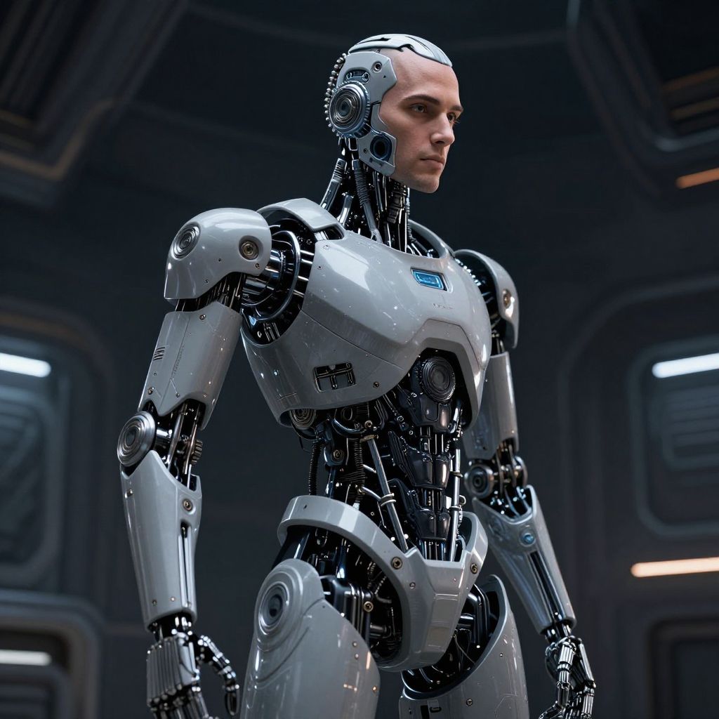 Futuristic Half-Human Half-Robot in Space Station