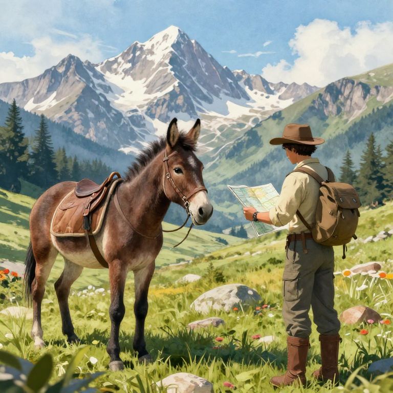 Assemblage a mule reading a map while setting out for an adventure in the mountains in a comic style, unreal engine cinematic, ultrarealistic, watercolor,