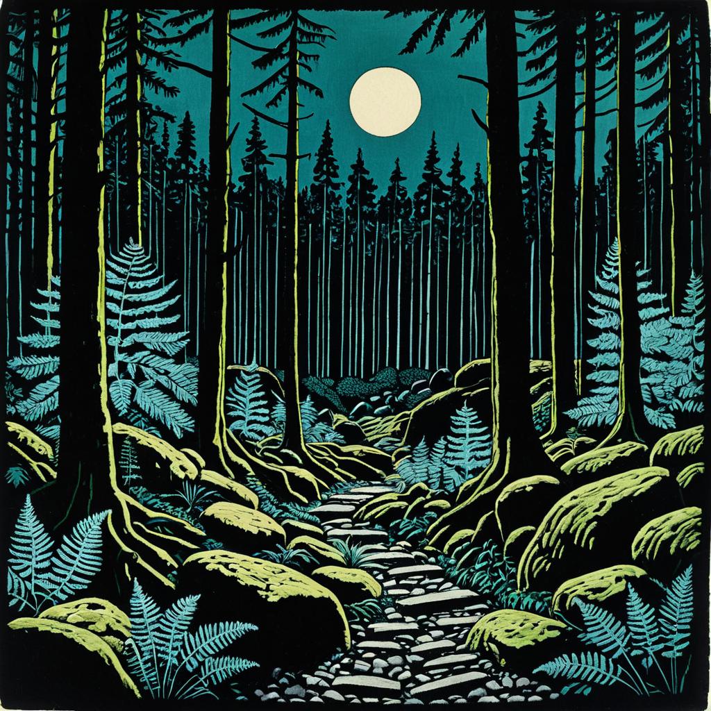 Block print of an abandoned railway station, surrounded by overgrown vines and rusted tracks, color, inspired by Paul Klee, evokes solitude