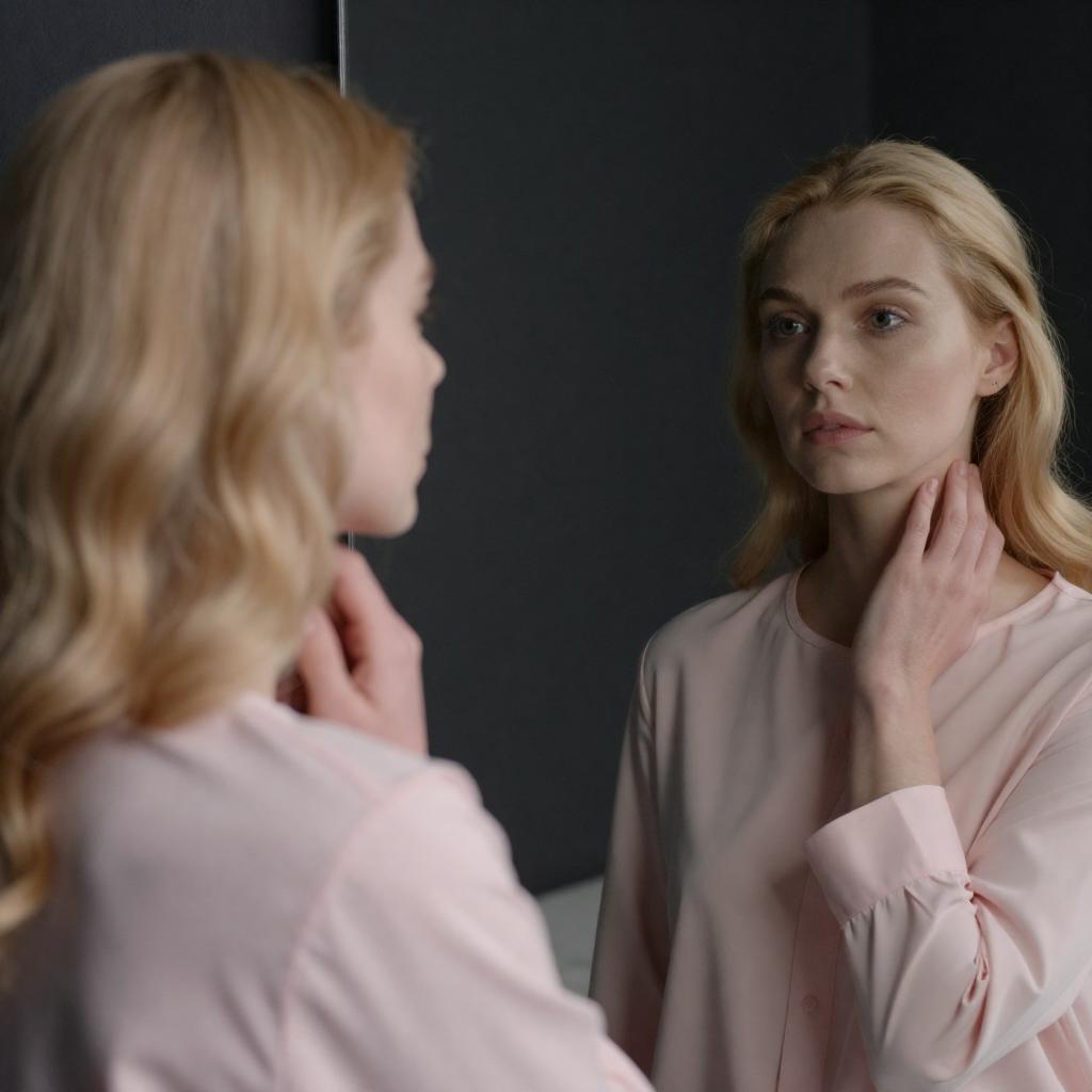 Blonde woman with slicked-back hair, light blue patterned shirt, neutral expression, standing in front of white door, brown coat on wall, pink wall, framed picture, soft light. Photographer's POV, slightly blurred background.