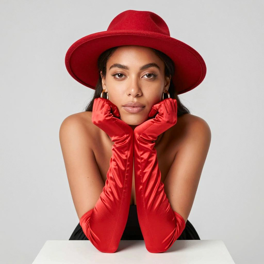 Photograph of a woman with light brown skin, wearing a red felt hat, red satin elbow-length gloves, and large gold hoop earrings. She is topless, resting her chin on her hands, leaning on a white cube. Her expression is neutral. Background is plain white. Her dark hair is pulled back.