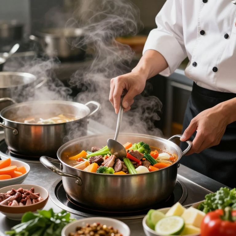 Chef meticulously prepares a vibrant stew, skillfully combining fresh vegetables and seasoned meats in a bustling kitchen, surrounded by steam rising from multiple pots and bowls filled with colorful ingredients.