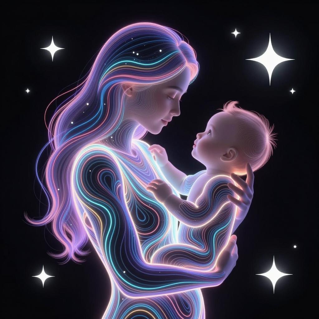 Digital illustration of a mother and baby, both glowing with neon colors. Mother with long, flowing hair, cradling baby, who gazes up at her. Both have intricate, swirling lines and light patterns. Black background. Mother's face is calm, baby's face is curious. Bright stars and sparkles surround them. Mother holds baby with both hands.