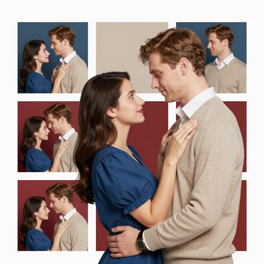Photograph of a couple in an intimate pose. Woman in blue dress and blouse, man in beige sweater and white shirt, both looking at each other. Four smaller photos in background. Woman with dark hair in blue dress, man with light brown hair. Woman's hand on man's shoulder, man's hand on her waist. Background colors: blue, beige, red. Woman's lips, red lipstick.