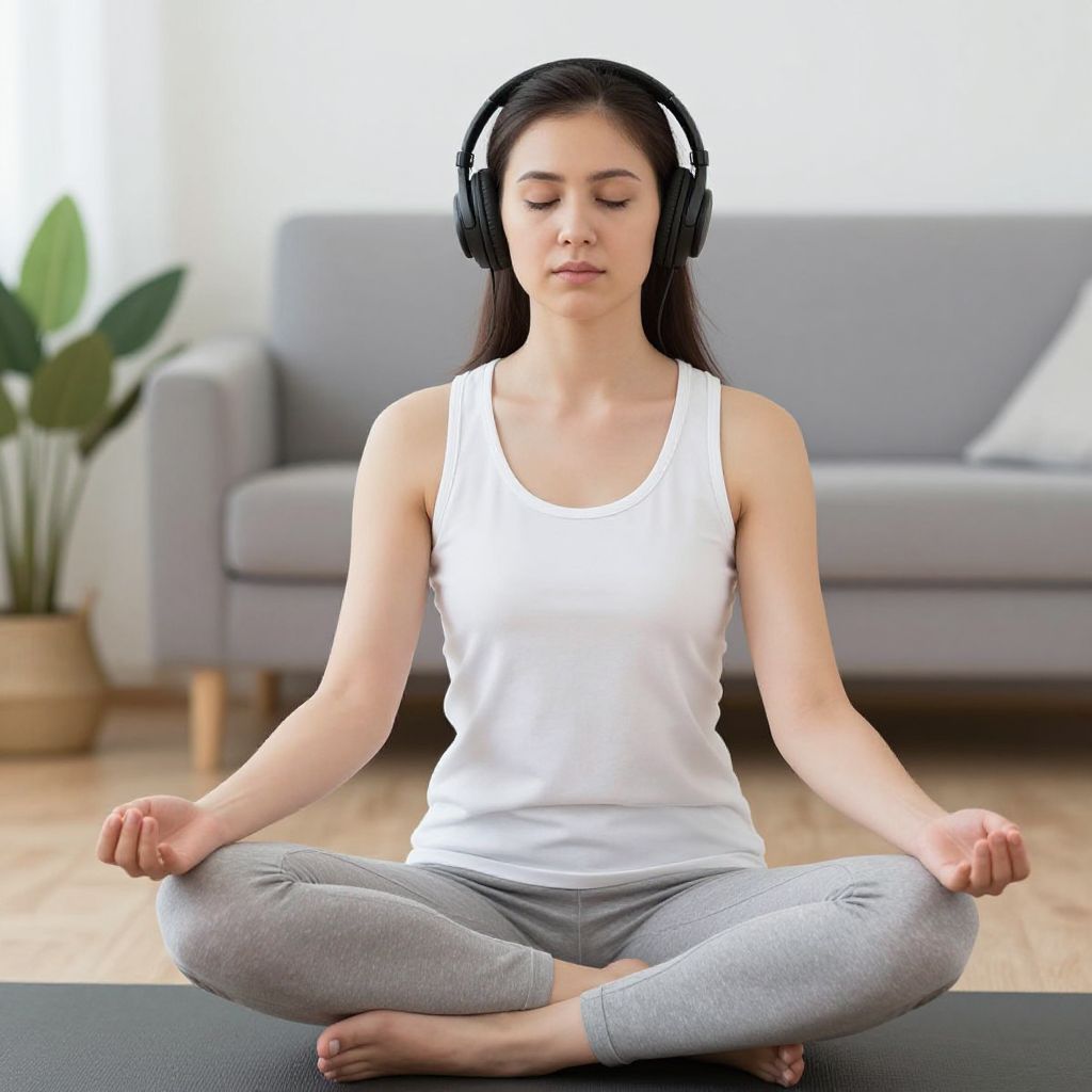 Photograph of a fair-skinned woman with dark hair, wearing a white tank top and black pants, sitting cross-legged in meditation, wearing black headphones