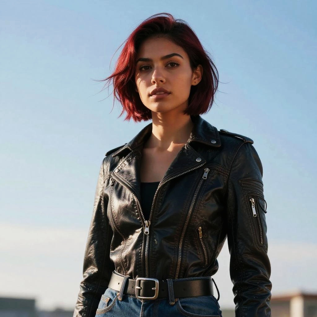 Photograph of a young woman with fair skin and short, straight red hair, standing against a clear blue sky. She has a serious expression and is wearing a black leather jacket with silver zippers and buttons, over a black top, paired with blue jeans and a black belt. The sunlight highlights the texture of the leather jacket, casting shadows that add depth. The background is slightly blurred, suggesting an outdoor setting. The overall style is modern and edgy, with a focus on bold, contrasting colors and textures.
