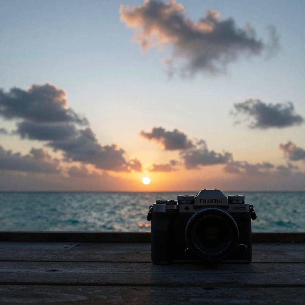 A photograph of a classic film camera silhouetted against a serene sunset over the ocean. The camera, positioned in the lower right foreground on a wooden surface, contrasts with the vibrant sky. The sunset, with its warm orange and pink hues, gently blends into the blue and purple of the evening sky, partially obscured by scattered clouds. The calm ocean stretches across the background, its surface reflecting the fading sunlight. The overall composition evokes a peaceful, nostalgic atmosphere, blending natural beauty with the timeless appeal of analog photography.