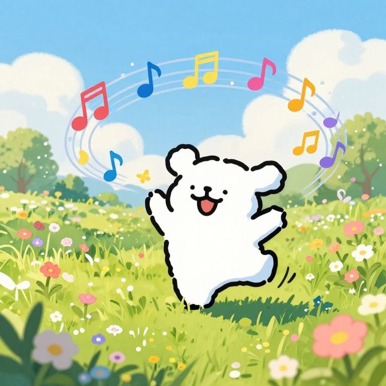 Cute ditty character dancing merrily with colorful musical notes swirling around in a sunlit meadow filled with wildflowers and butterflies, fantasy illustration blending realism and cartoonish charm, vibrant colors and dynamic composition.