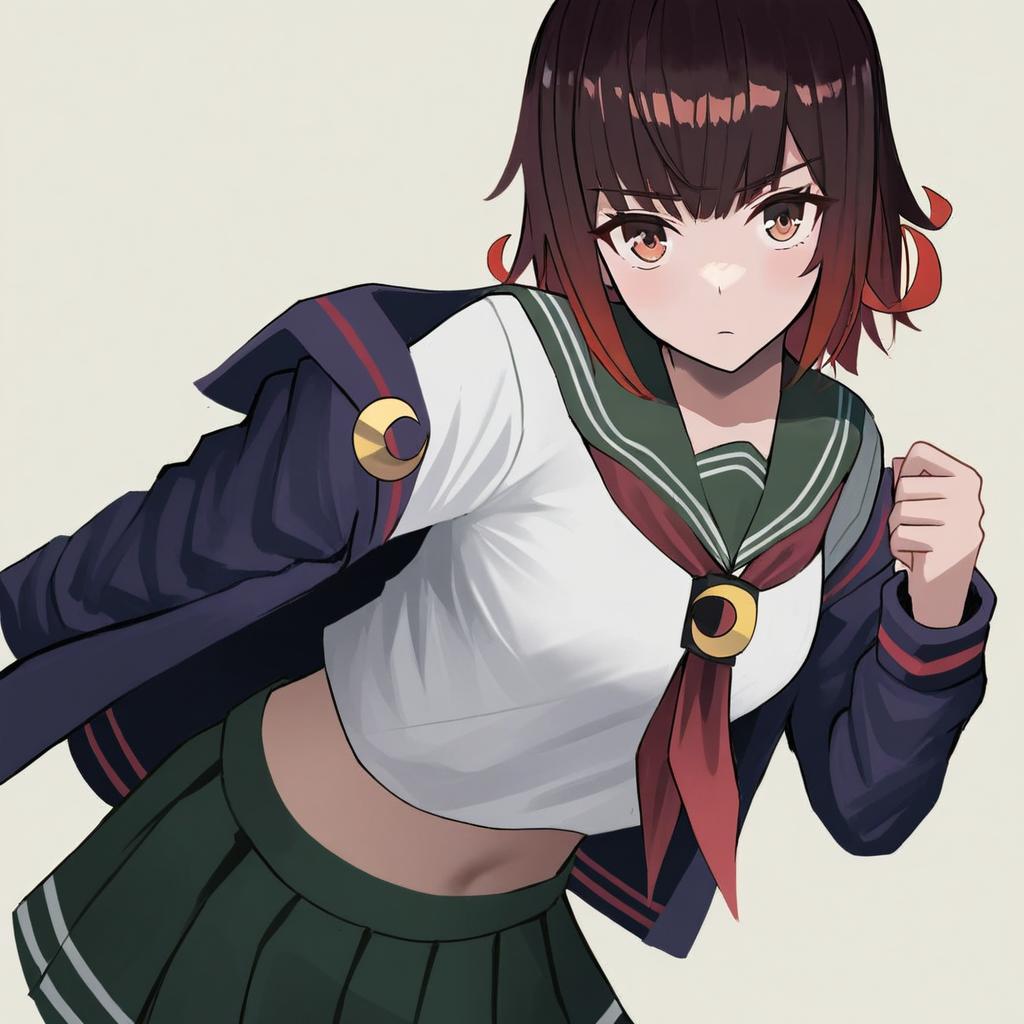 Mutsuki kai ni (kancolle), kantai collection, 1girl, red eyes, brown eyes, short hair, brown hair, gradient hair, red hair, serafuku, serafuku, green skirt, pleated skirt, green sailor collar, crescent pin, red neckerchief, by artist jourd4n, animagine