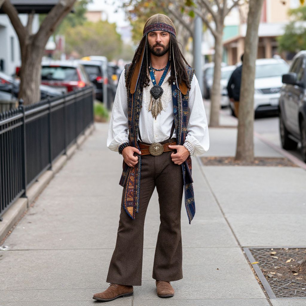 Hippie Dude Man Costume, man dressed in a costume and hat standing on a sidewalk