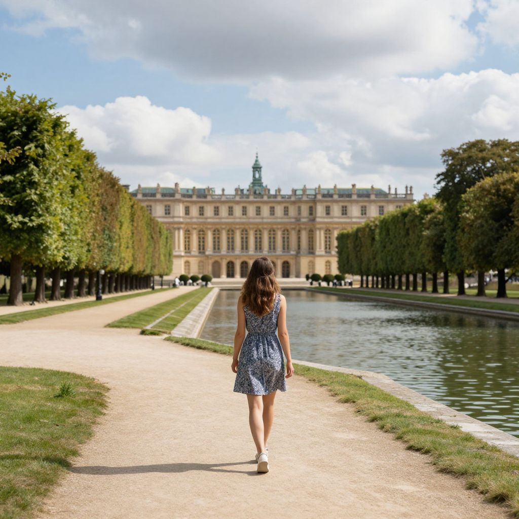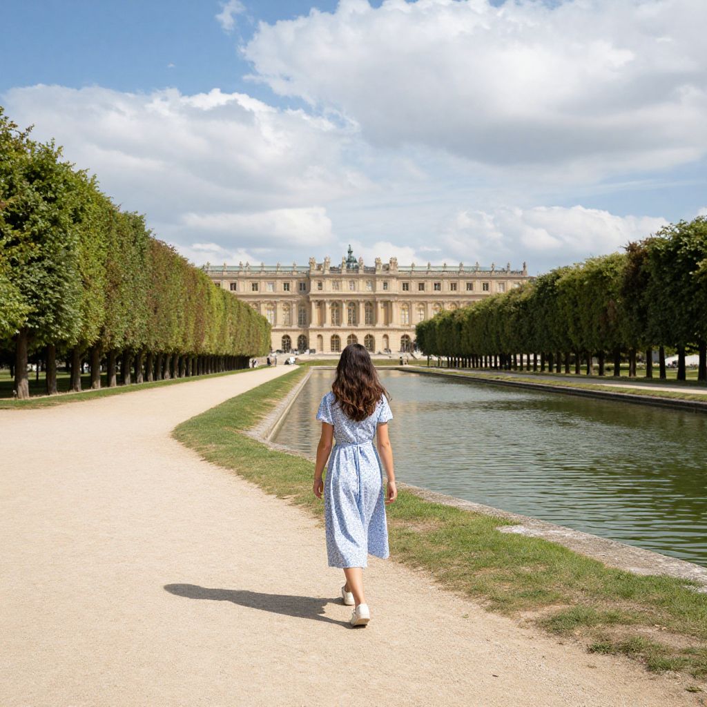 Woman strolling along a serene pathway in Versailles, flanked by symmetrical rows of trees and a tranquil water canal, with the grand palace in the background under a partly cloudy sky.