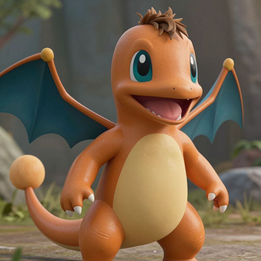 A whimsical, handcrafted crochet amigurumi Charmander Pokémon, with its vibrant orange body, emerald-green wings, and cheerful expression, embodies the magical fusion of fantasy and craftsmanship, defying the boundaries of reality with its charmingly surreal presence.