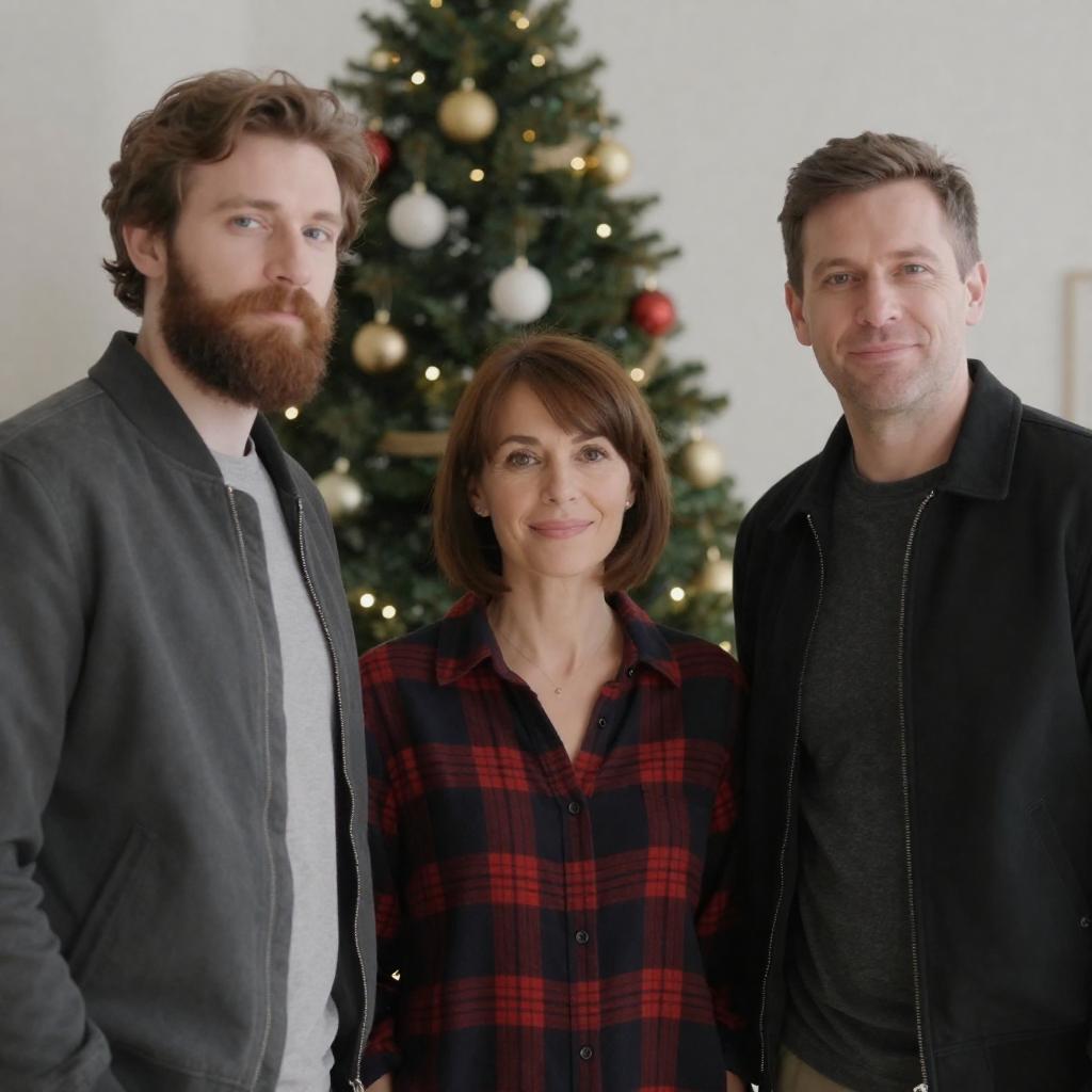 Photograph of a smiling couple in a warmly lit room. The woman, with short brown hair and wearing a black sweater over a white shirt, leans into the man, who has short brown hair and wears a red sweater over a white shirt. They stand close, with the man's arm around her shoulders. A lamp and framed picture are in the background.