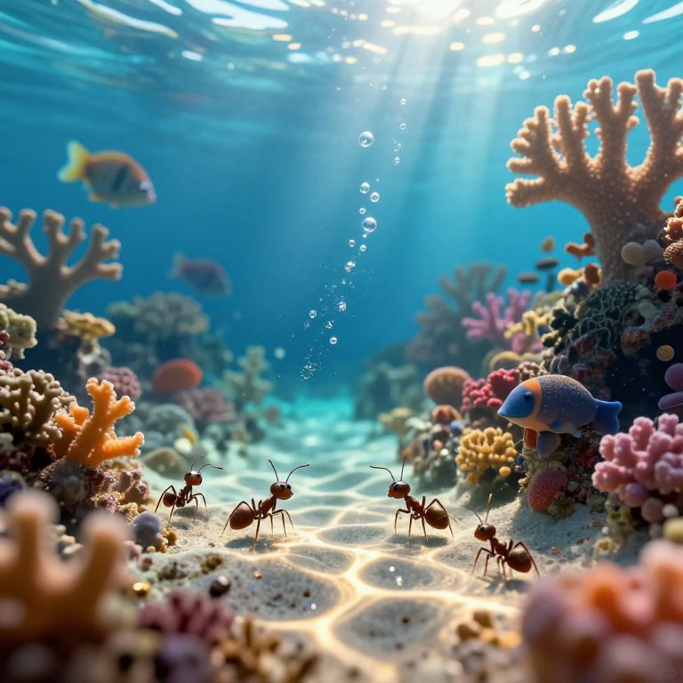 Imagine a surreal digital artwork reminiscent of dreamlike landscapes, depicting an underwater scene from an ant's perspective. In this captivating image, an intricate coral reef teems with vibrant marine life, while tiny bubbles of air, resembling floating galaxies, swirl around the curious ants exploring the depths. The composition is illuminated by ethereal, golden light filtering through the clear blue water, casting long, shimmering shadows across the ocean floor. This whimsical and thought-provoking image evokes a sense of wonder and curiosity as viewers are invited to witness the fantastical underwater world through the eyes of these tiny explorers.