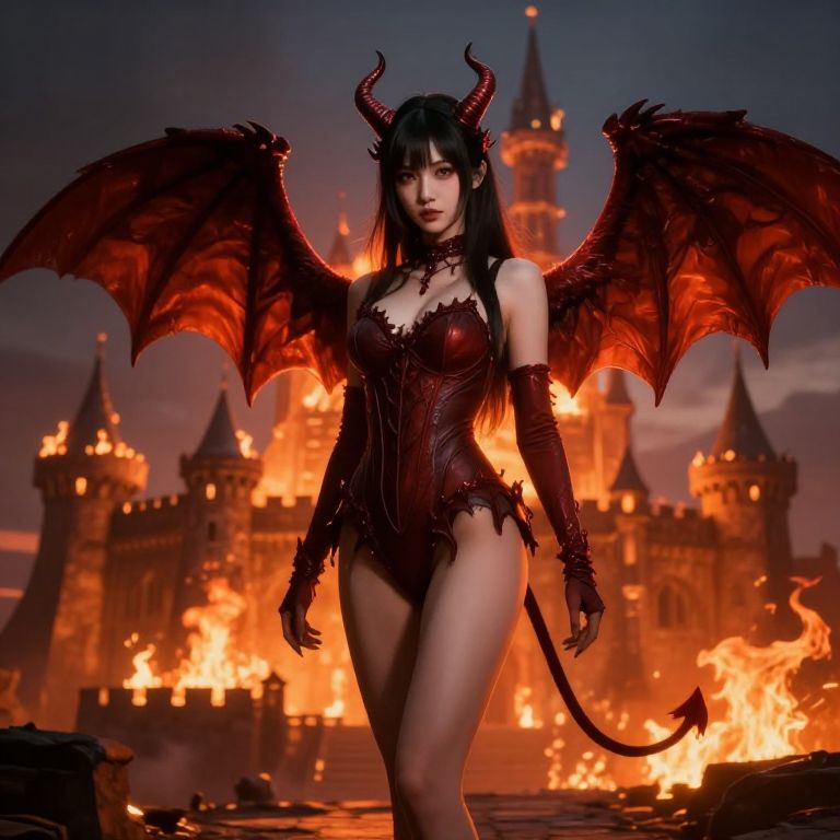 Digital artwork of a seductive demon woman with black horns, red wings, and corset, standing in front of a burning castle.