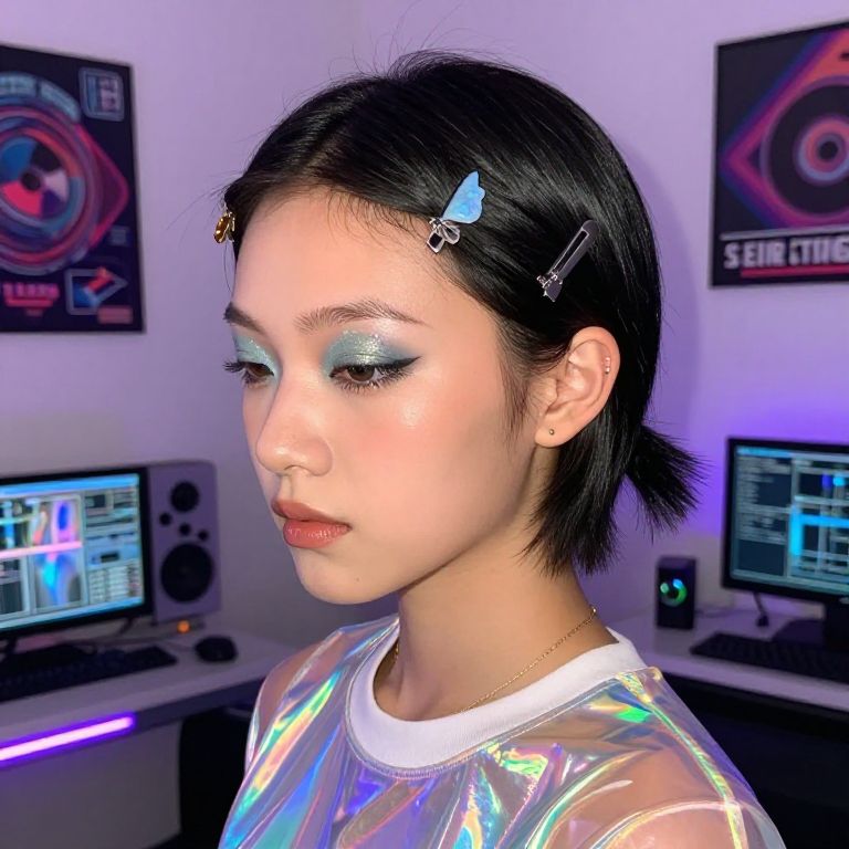 Short hair y2k look, sleek low ponytail with butterfly clips, shimmering eyeshadow, holographic clothing, vintage tech-inspired room, pop culture energy