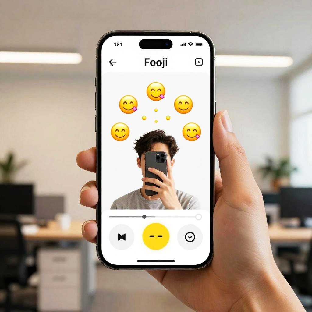 Face emoji remover app demo, a person using a mobile phone where emojis vanish from their selfie image, sleek user interface with buttons and sliders, modern tech aesthetics, blurred office background, warm lighting, intuitive design