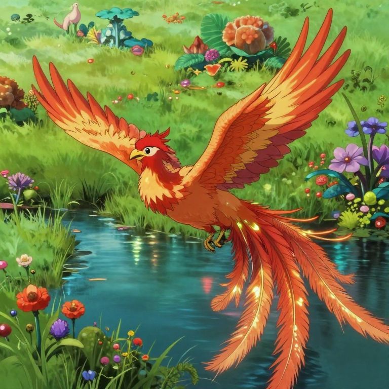 A mesmerizing digital artwork showcases an awe-inspiring phoenix gracefully soaring above a captivating moonlit garden, its radiant plumage casting shimmering reflections upon serene ponds adorned with lush water lilies. Viewers are invited to witness this enchanting vista from the unique vantage point of a dragonfly, enveloped in a world where beauty and wonder seamlessly intertwine, reminiscent of the spellbinding realms brought to life by Studio Ghibli's masterful storytelling, evoking an atmosphere of profound tranquility and amazement.