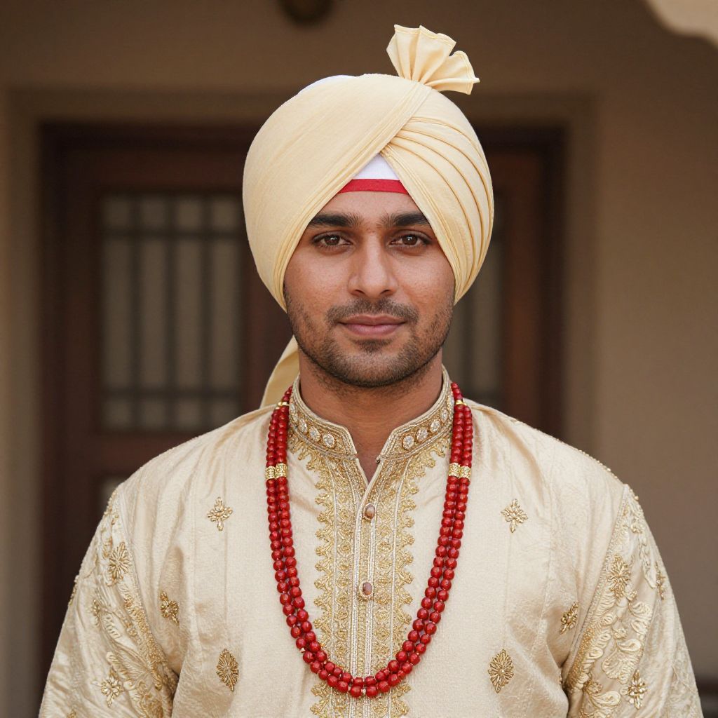A man with a turban on his head is wearing a traditional Indian outfit with gold embroidery and red beads on his neck.