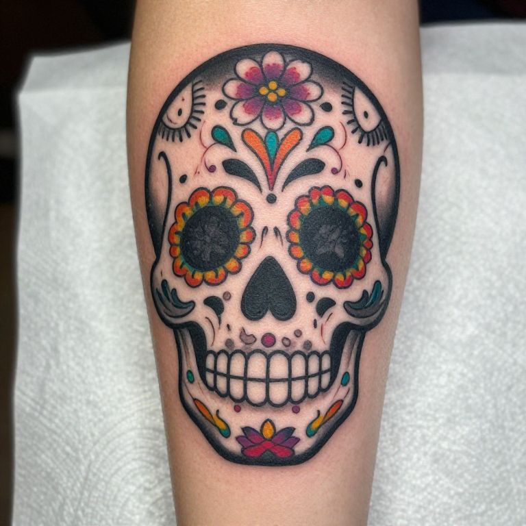 Skull calf tattoo depicting a stylized sugar skull with intricate floral patterns, symmetrical design in black ink with hints of bright colors around the eyes, combining traditional Mexican Dia de los Muertos themes with modern tattoo artistry