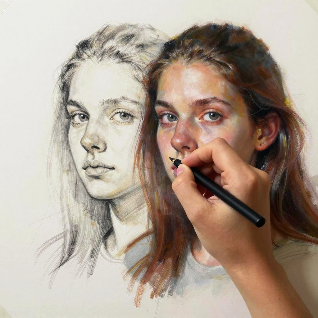Sketch to AI art concept featuring an artist's hand drawing a simple portrait which seamlessly transitions into a hyper-realistic, AI-enhanced painting with dynamic lighting, intricate details, and vibrant hues, capturing the fusion of human creativity and artificial intelligence.