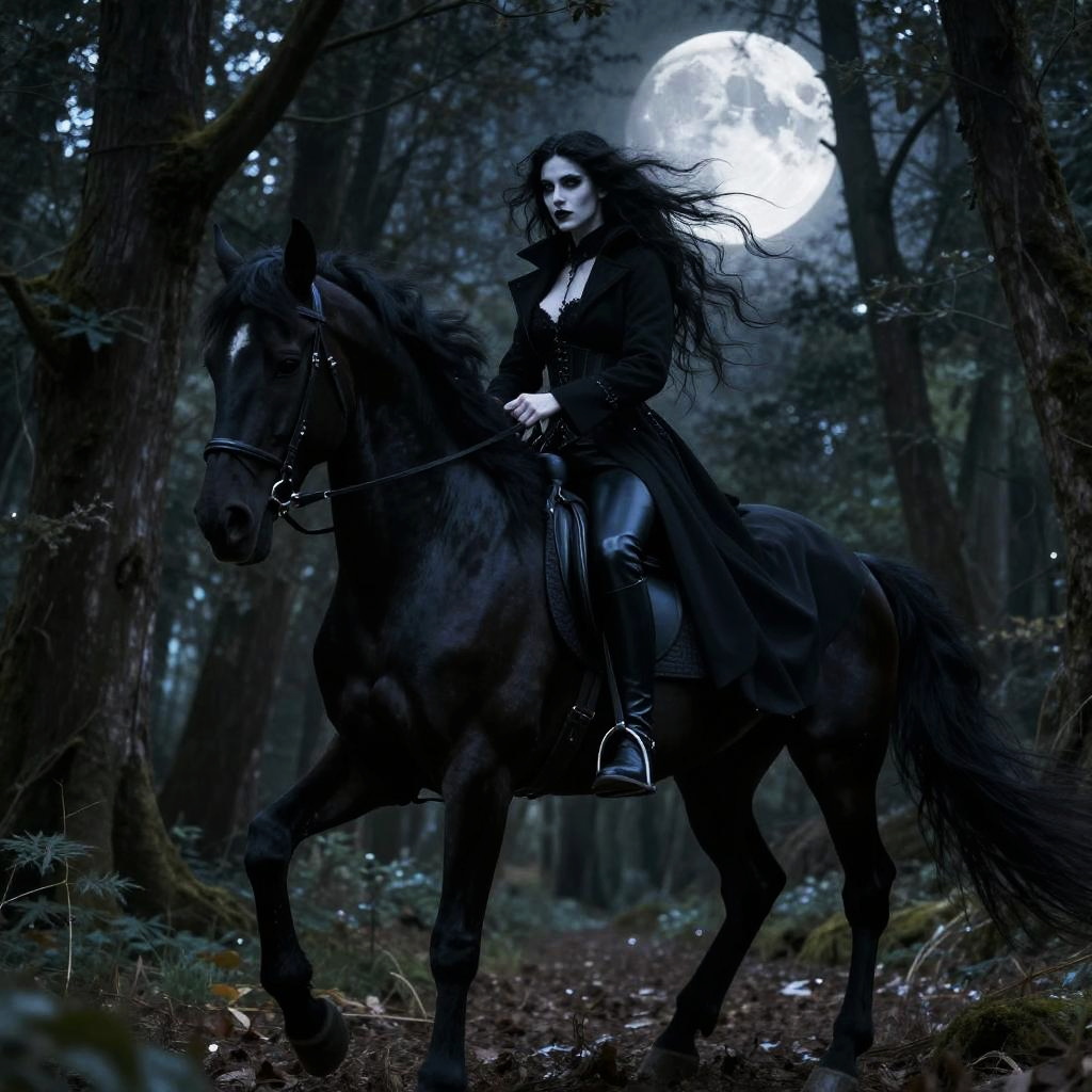 Goth domme riding a black stallion through a moonlit forest, dressed in a dramatic long black coat with high boots and corset, wind sweeping dark hair, pale skin illuminated by silver moonlight, ethereal and commanding presence amidst the enchanted woods.