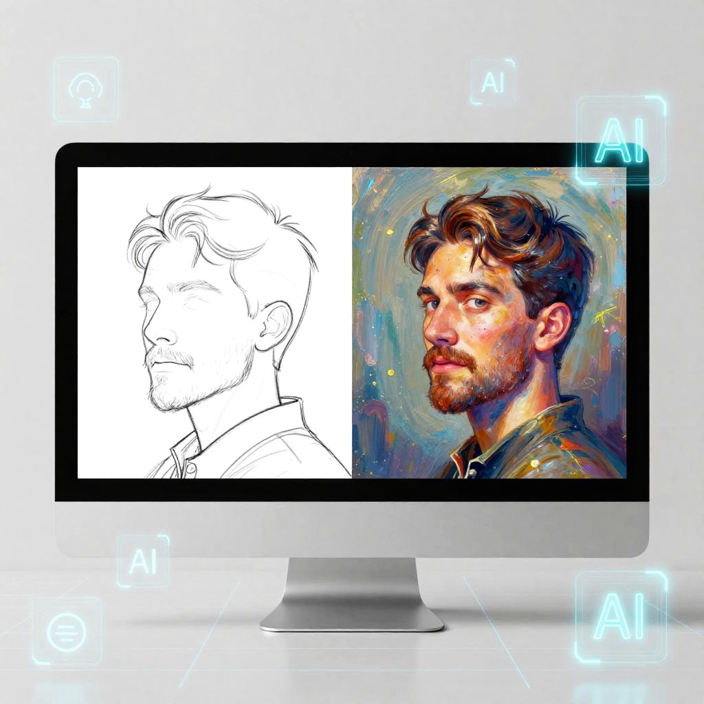 Sketch to image AI online concept, a modern computer screen showing a split view of a simple black-and-white outline transforming seamlessly into a detailed colorful painting, surrounded by virtual AI icons, futuristic design with glowing grids and holographic effects
