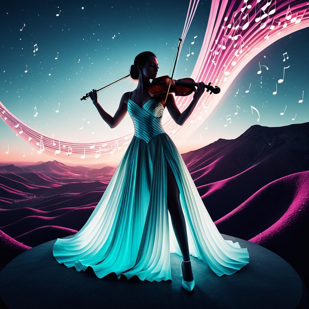 A surreal fashion scene of a violinist in luminous gradient fabrics, set against an epic landscape with giant glowing musical notes floating around, dynamic low-angle composition, bold curving lines, sophisticated and clean