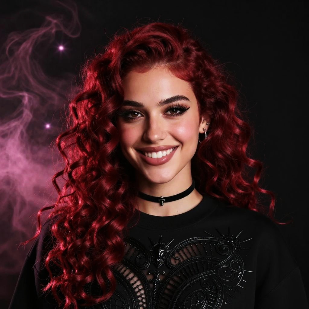 21yo DV_Manuela_Vicious ((Black Theme, Black backdrop:1.4)) (Close-Up Shot, headshot:1.4) (red long curls :1.4)wearing (Black sweatshirt :1.4) 35mm, F/2.8 ((Photo Focus, DOF, Aperture, insanely detailed and intricate, character, hypermaximalist, elegant, ornate, beautiful, exotic, revealing, appealing, attractive, amative, hyper realistic, super detailed, heresy flares)) (smiling at viewer:1.3)(volumetric pink smoke:1.3) (pink lens flare:1.2)(sharpness:1.3)(details:1.3)