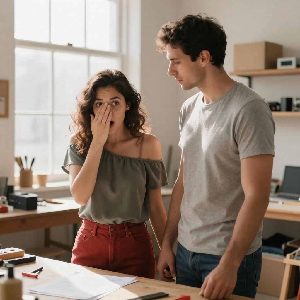 Photograph of four people in a modern room. Blonde man in gray sweater stands left, scratching head. Bearded man in red sweater stands center, arms crossed. Woman with dark brown hair, bangs, sipping drink, sits middle, laptop in front. Brown-haired man in plaid shirt sits right, arms crossed. Bright room with large window, green walls. Intense expressions. Laptop has stickers.