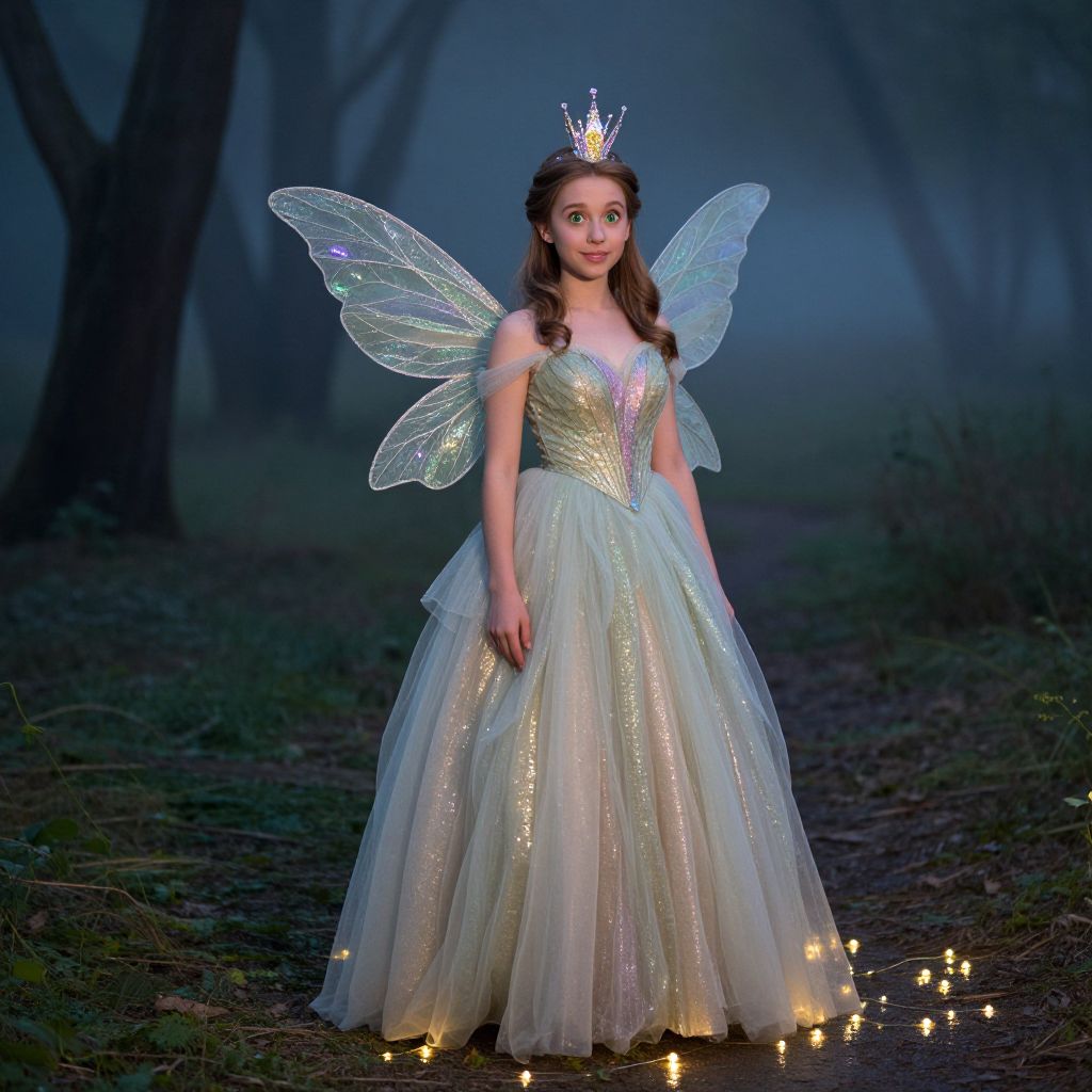 Fiona dressed in a whimsical fantasy fancy dress costume — a fairy-themed gown with shimmering tulle, glittering wings, and a sparkling crown — standing on a misty forest clearing at twilight, her face is expressive and serene, with wide green eyes and a soft smile, glowing fairy lights reflecting in the damp ground