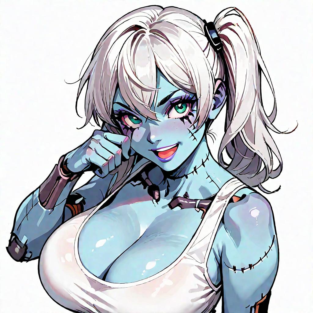 Score_9, score_8_up, score_7_up, score_6_up, score_5_up, score_4_up, (source_anime), solo, long hair, breasts, looking at viewer, smile, open mouth, blue eyes, simple background, white background, cleavage, hair between eyes, bare shoulders, collarbone, upper body, white hair, teeth, huge breasts, side ponytail, torn clothes, colored skin, tank top, black nails, blue skin, stitches, torn shirt, zombie, patchwork skin, stitched face
