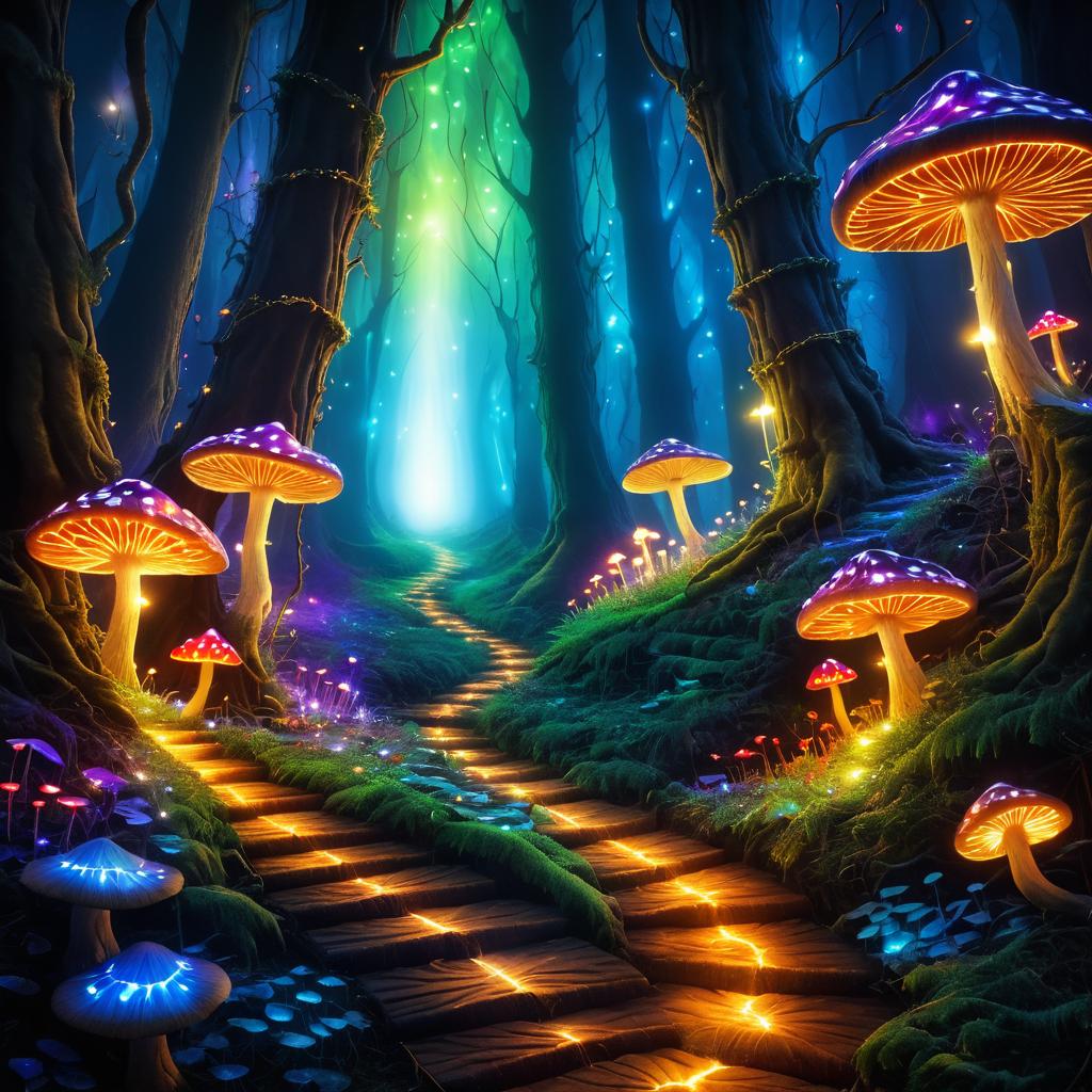 Fantasy painting of a mysterious forest pathway lit by glowing mushrooms, with intricate detail and vivid colors.