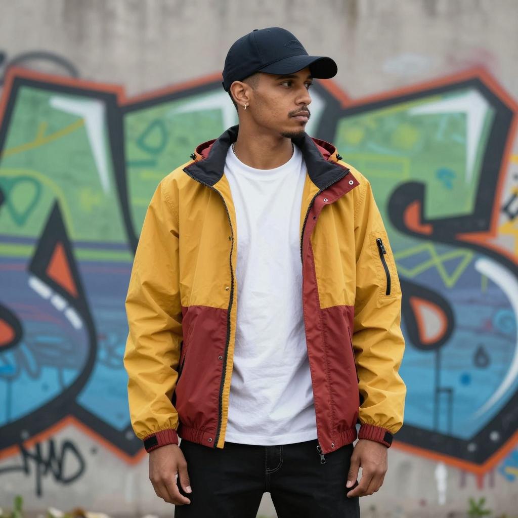 Black-and-white photograph of a young man with a shaved head, sitting on a checkered blanket. He wears a white t-shirt with a graphic design and dark pants. Background features a beach mural, six playing cards, and a poster with "I Ain't Goin' Anywhere." Man looks slightly to the left with a neutral expression.