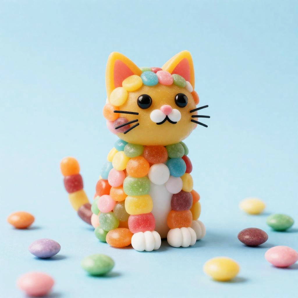 A vibrant playful cat figure made entirely of colorful candy pieces and jellybeans, sitting on a smooth light blue surface scattered with additional pastel-colored candy pieces, bright and cheerful atmosphere, pop art style, orange yellow pink green blue color scheme